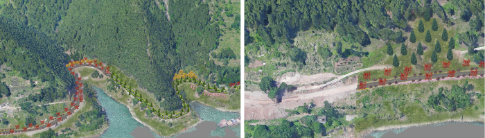 工作人员基于无人机四川倾斜摄影获取的数据,首先设置相机参数,通过自由网空中三角测量确定地物大致位置,随后对控制点进行刺点 定位,并利用控制网平差进一步确定地理位置,最后设置模型其它相关参数,由此建立起林草现状三维立体模型。接着在三维模型中利用Photoshop、模型单体化,树木建模等技术,依据造林规划对重点区域进行了可视化种植模拟及道路铺建,开展因地制宜地的植树造林规划,并真实模拟展示数年后的植树造林成果。